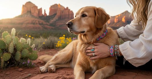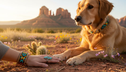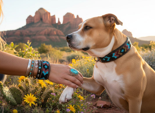 Step into the spirit of the Southwest with the NavaPaw Collection. These artisan-crafted dog collars feature hand-beaded patterns inspired by Navajo and desert landscapes. Each collar is made with genuine leather, detailed with carved feather and leaf designs, and finished with vibrant beadwork in earthy and bold hues. Durable yet soulful, the NavaPaw Collection brings together heritage artistry and everyday function, perfect for dogs who embody adventure and heart.