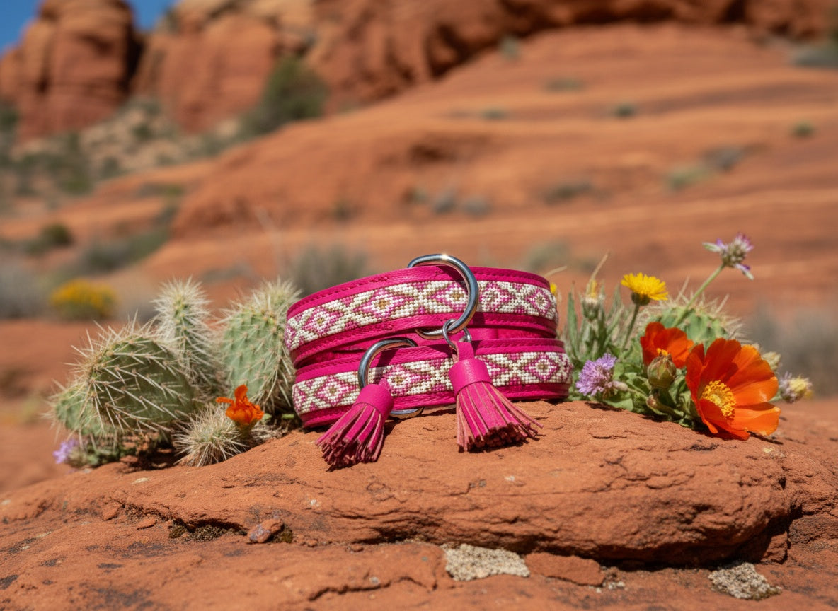Inspired by Sedona’s dreamy pink sunsets, this handcrafted genuine leather dog collar features delicate hand-beaded patterns in blush, cream, and earthy tones. A tassel and polished gold hardware complete the look, making it a boho chic piece with heart and soul.