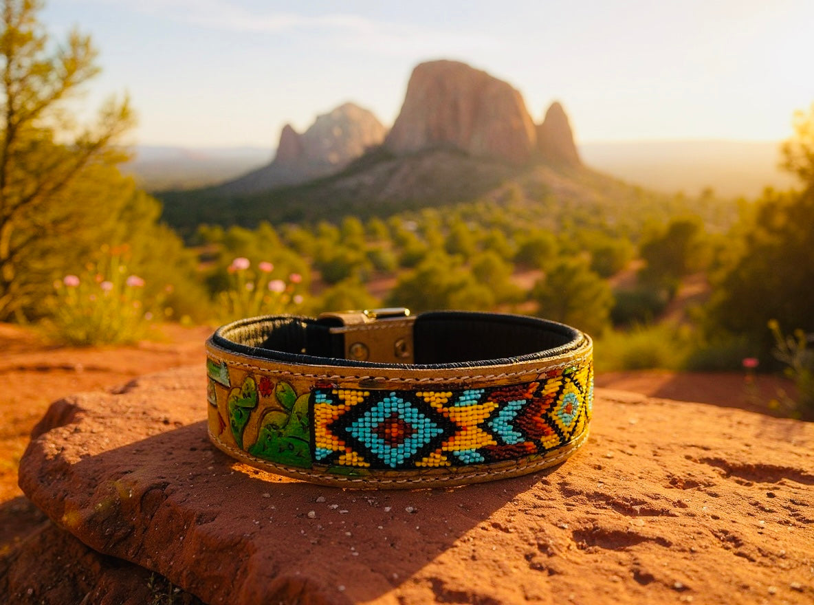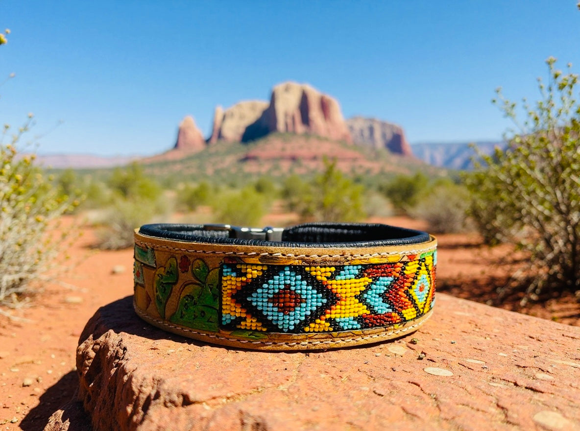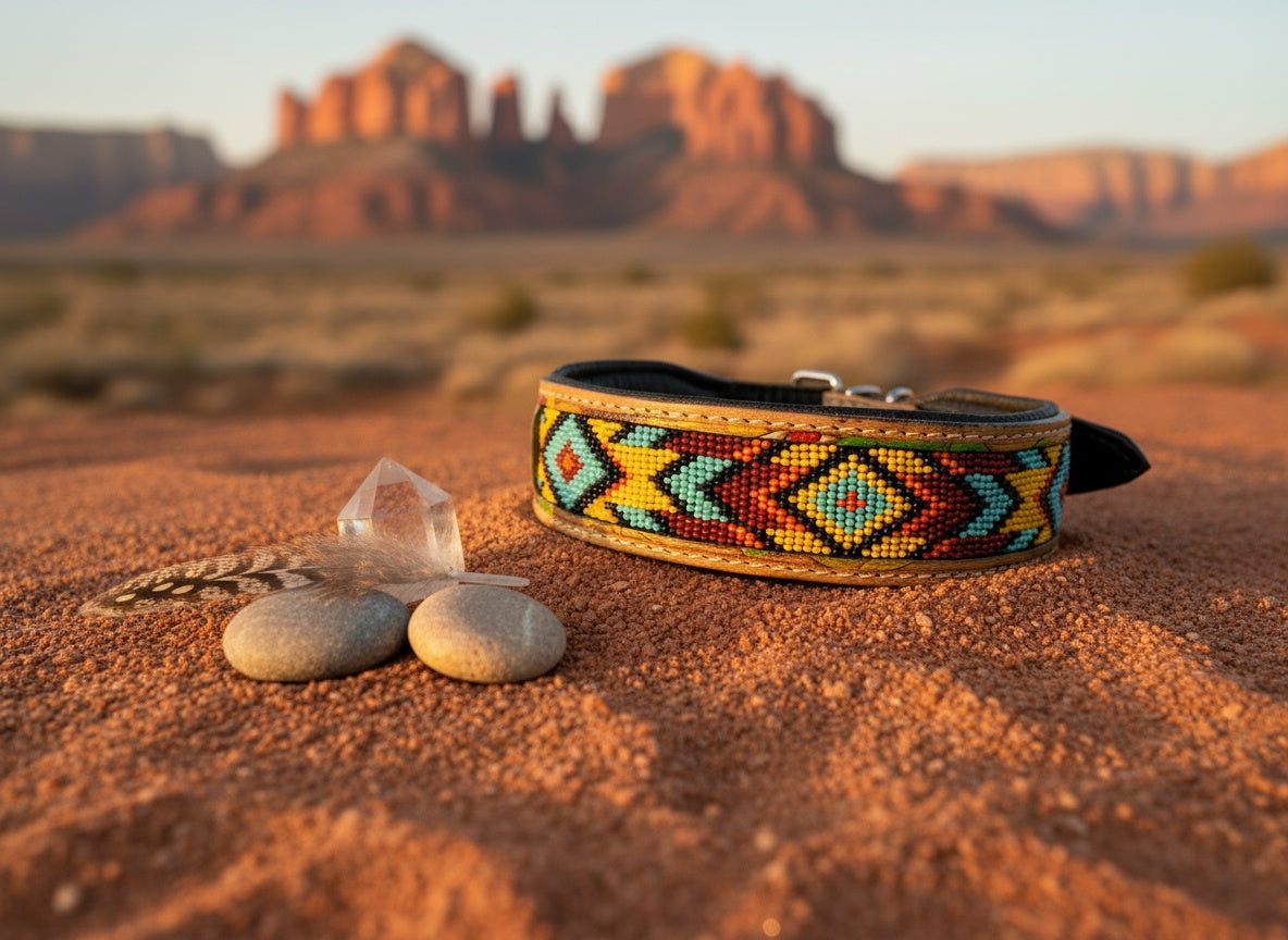 Capture the magic of Sedona’s desert sunsets with the NavaPaw Sunburst Collar. This artisan-crafted collar features vibrant golden yellow, turquoise, and earthy beadwork alongside hand-tooled leather adorned with a snake motif—symbolizing protection and transformation. Built on a durable leather base with sturdy hardware, it’s both functional and expressive: perfect for pups who dare to shine.