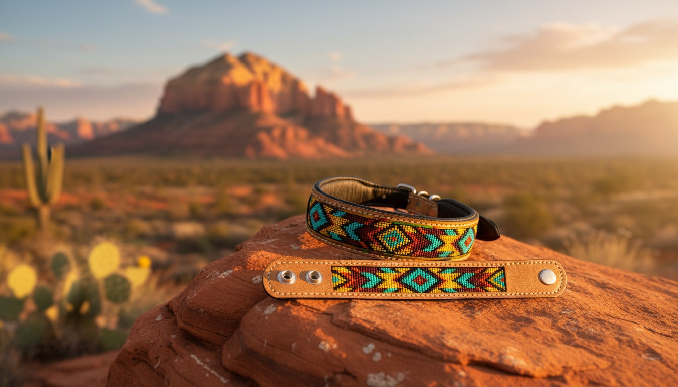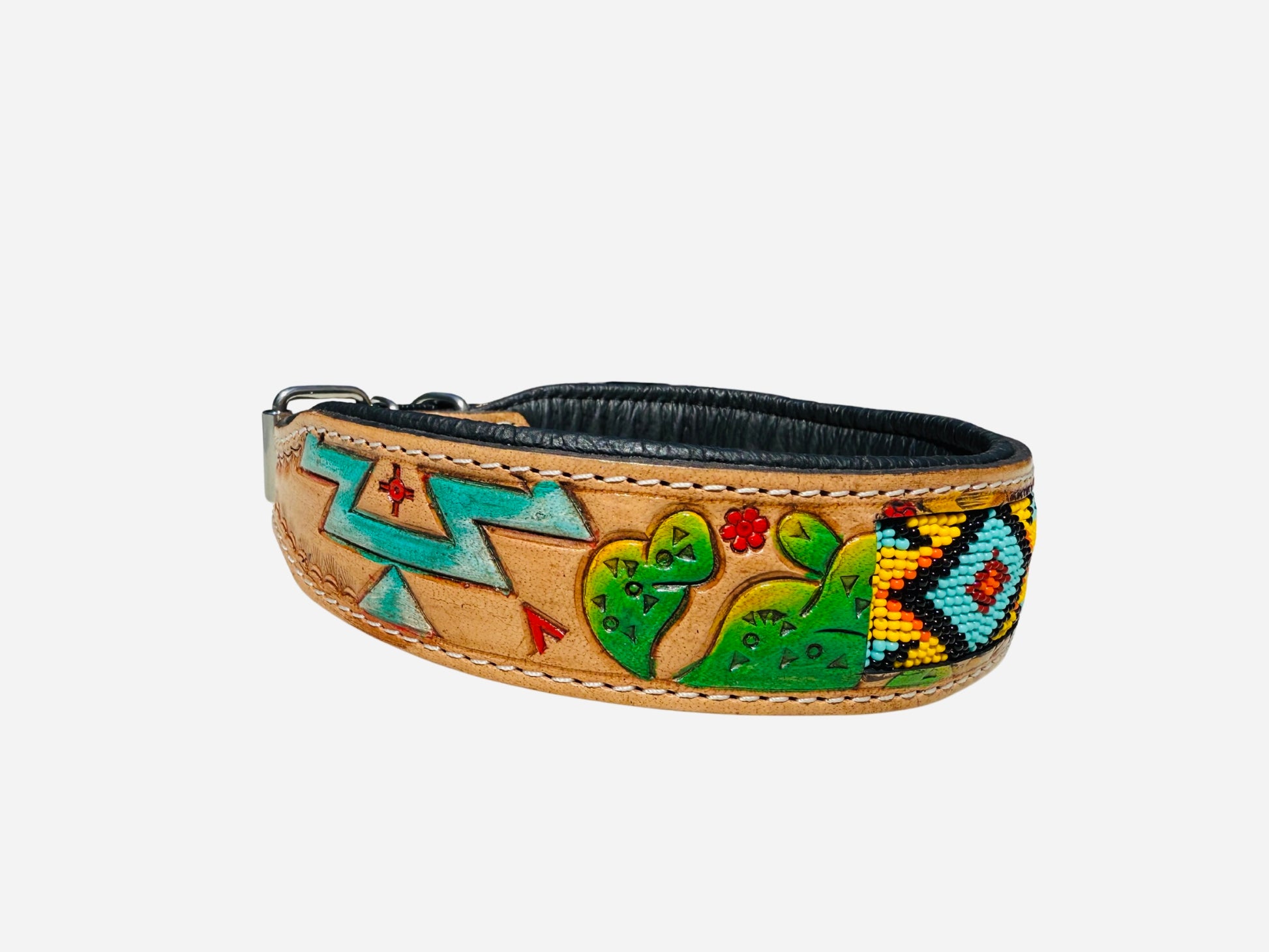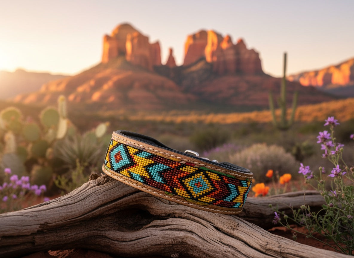 Capture the magic of Sedona’s desert sunsets with the NavaPaw Sunburst Collar. This artisan-crafted collar features vibrant golden yellow, turquoise, and earthy beadwork alongside hand-tooled leather adorned with a snake motif—symbolizing protection and transformation. Built on a durable leather base with sturdy hardware, it’s both functional and expressive: perfect for pups who dare to shine.