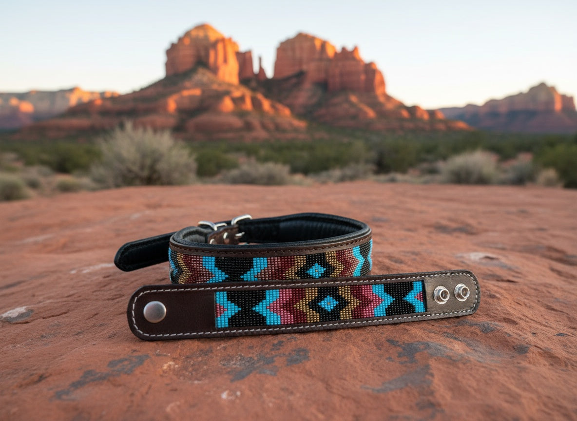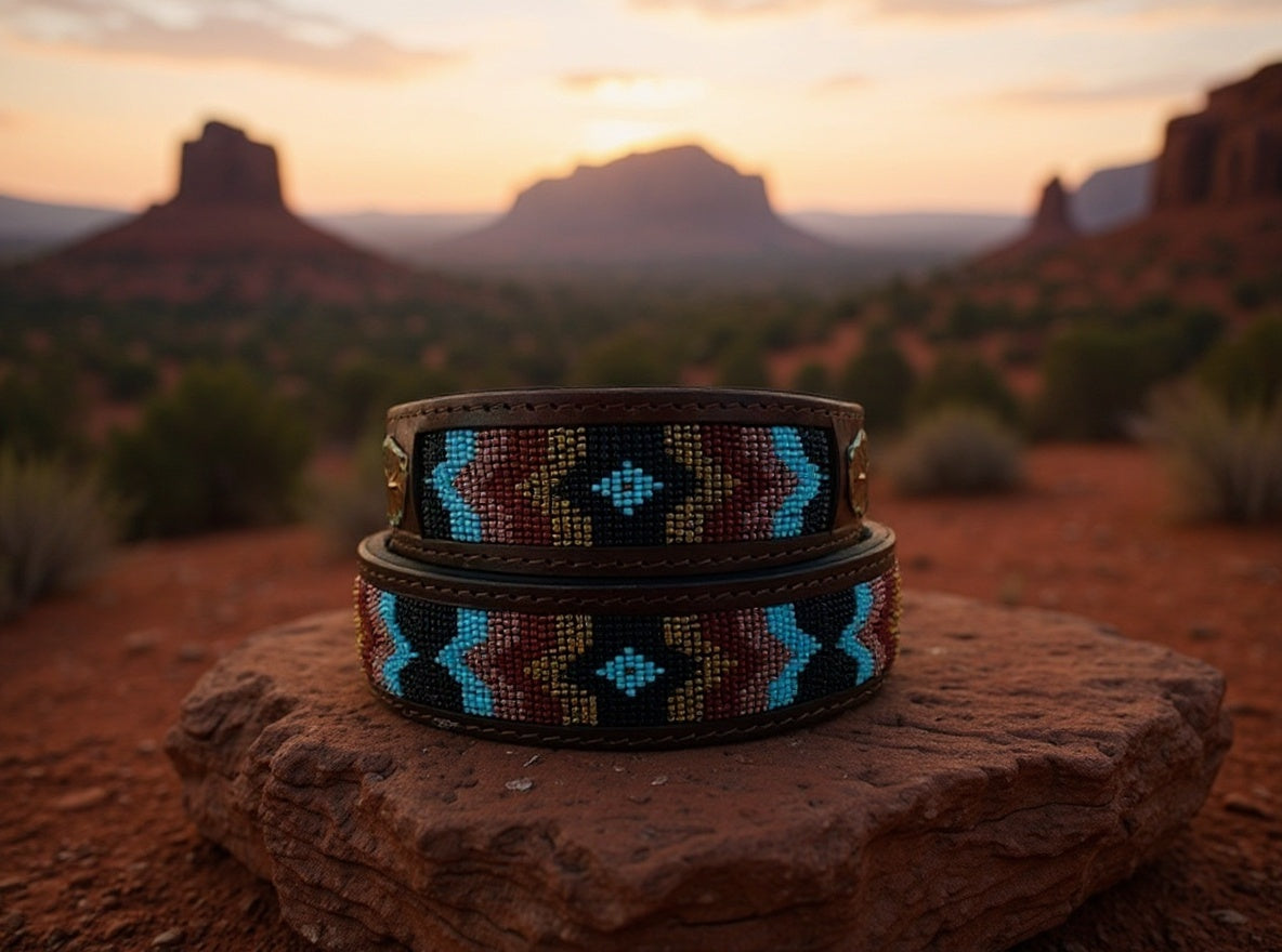 Grounded and full of desert spirit 🌵, the NavaPaw Canyon Collar mirrors the rugged beauty of canyon walls and open skies. Hand-beaded in rich earth tones with pops of turquoise, it rests atop dark brown tooled leather embossed with desert leaves. Built for both comfort and longevity, this collar features durable silver hardware and a soft leather lining.