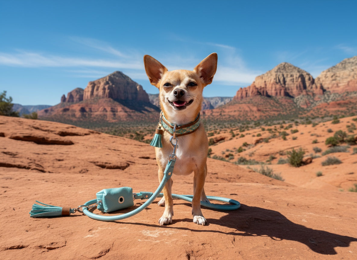 Channeling Sedona’s bright desert skies, this handcrafted genuine leather dog collar is adorned with hand-beaded patterns in turquoise, cream, brown, and gold accents. The bold beading, finished with a tassel and gold hardware, creates a boho chic design that radiates light and spirit.